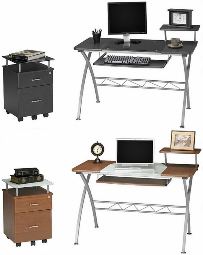 This compact computer desk from Mayline features a contemporary glass inset on the desktop. This space saving desk is ideal for your home office or business.